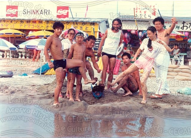 Viagem do Mestre Reginaldo da Associação de Capoeira Lenço de Seda para o Japão, para aperfeiçoamento da prática da acupuntura ,e levar o conhecimento da arte da Capoeira.Na foto : Capoeiristas em praia próximo a Tokyo .