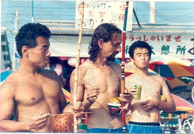 Viagem do Mestre Reginaldo da Associação de Capoeira Lenço de Seda para o Japão, para aperfeiçoamento da prática da acupuntura e levar o conhecimento da arte da Capoeira.Na foto grupo de capoeira em momento informal na praia de Tokyo .