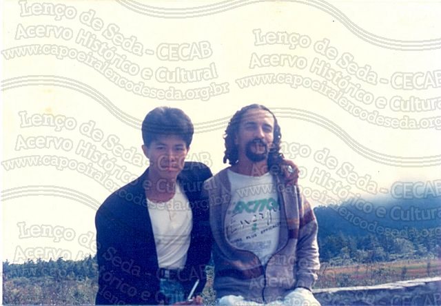 Viagem do Mestre Reginaldo para o Japão, para aperfeiçoamento da prática da acupuntura e levar o conhecimento da arte da Capoeira.Na foto momento de pausa na viagem ao Templo de Kiodo- Tókio, interior do Japão.